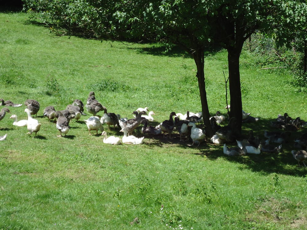 Die Gänse kommen ca. anfangs Juni als 6-wöchige Küken zu uns. Sie haben grosszügige Grasweiden, einen Weiher oder den Bach zur Verfügung. Die Nacht verbringen sie sicher und geschützt im Stall.
