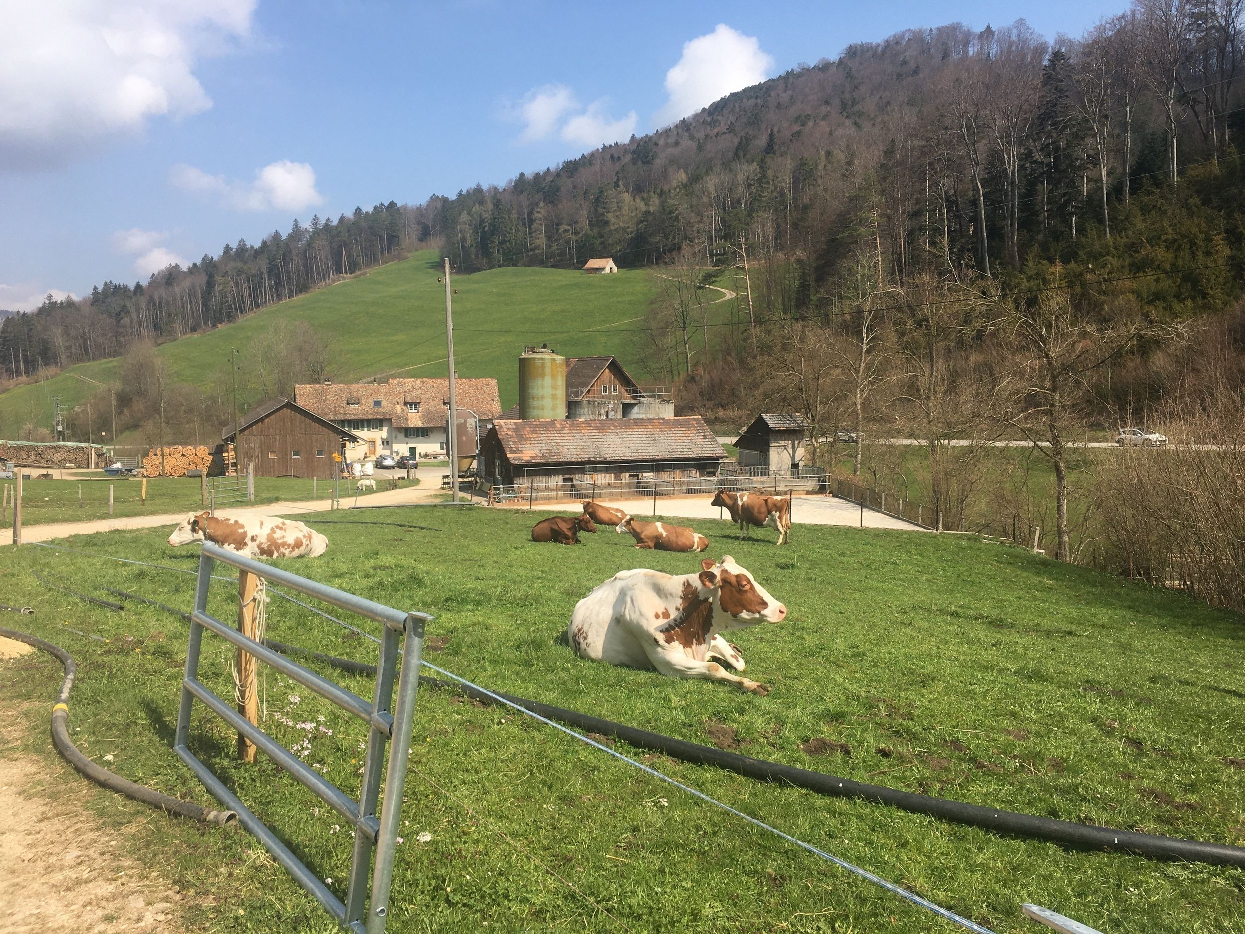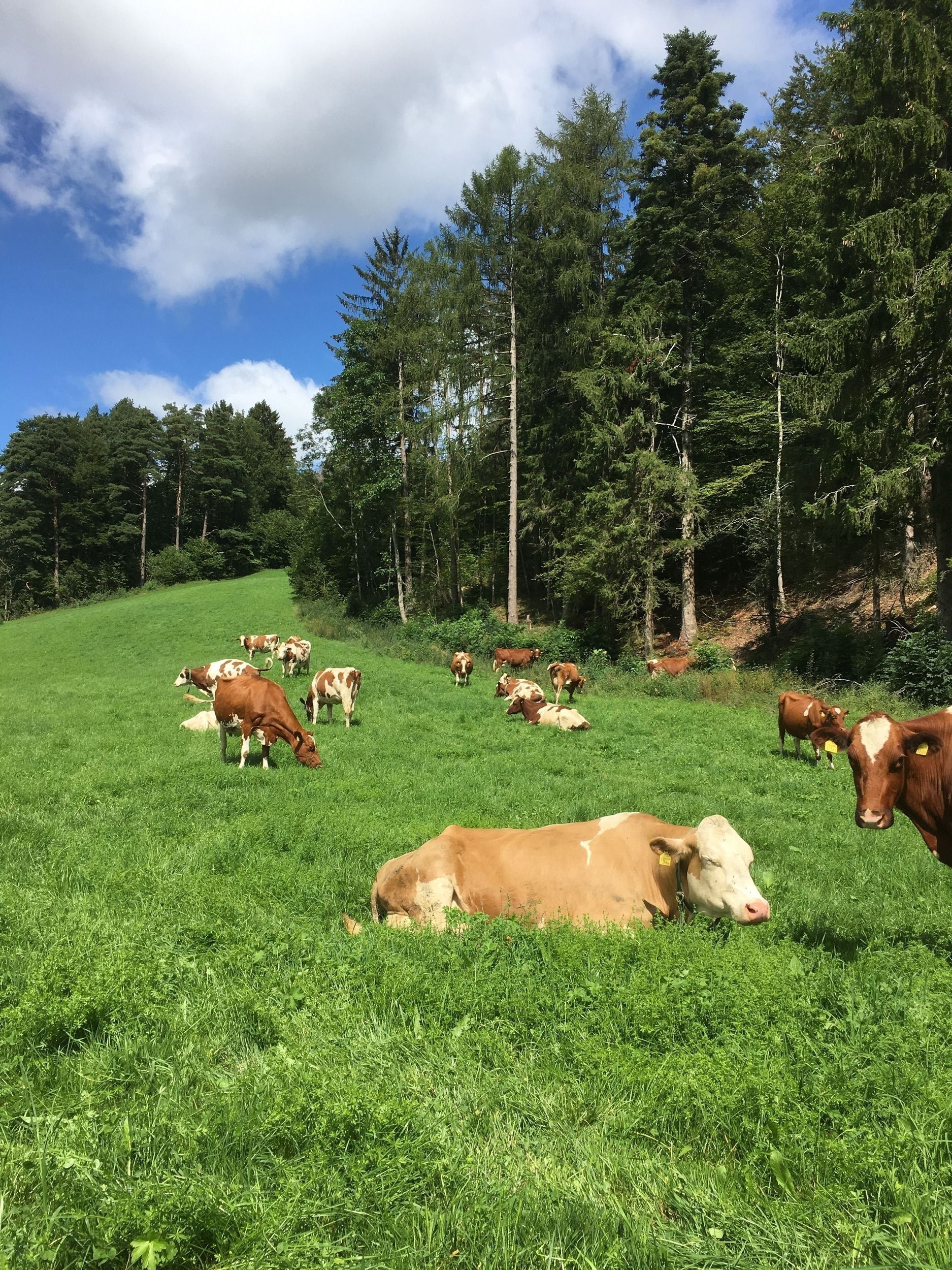 35 Milchkühe der Rasse SF (Swiss Fleckvieh) sowie ungefähr 30 Jungtiere sind auf unserem Betrieb zu Hause. Wir produzieren Industriemilch an die Emmi und die Elsa.