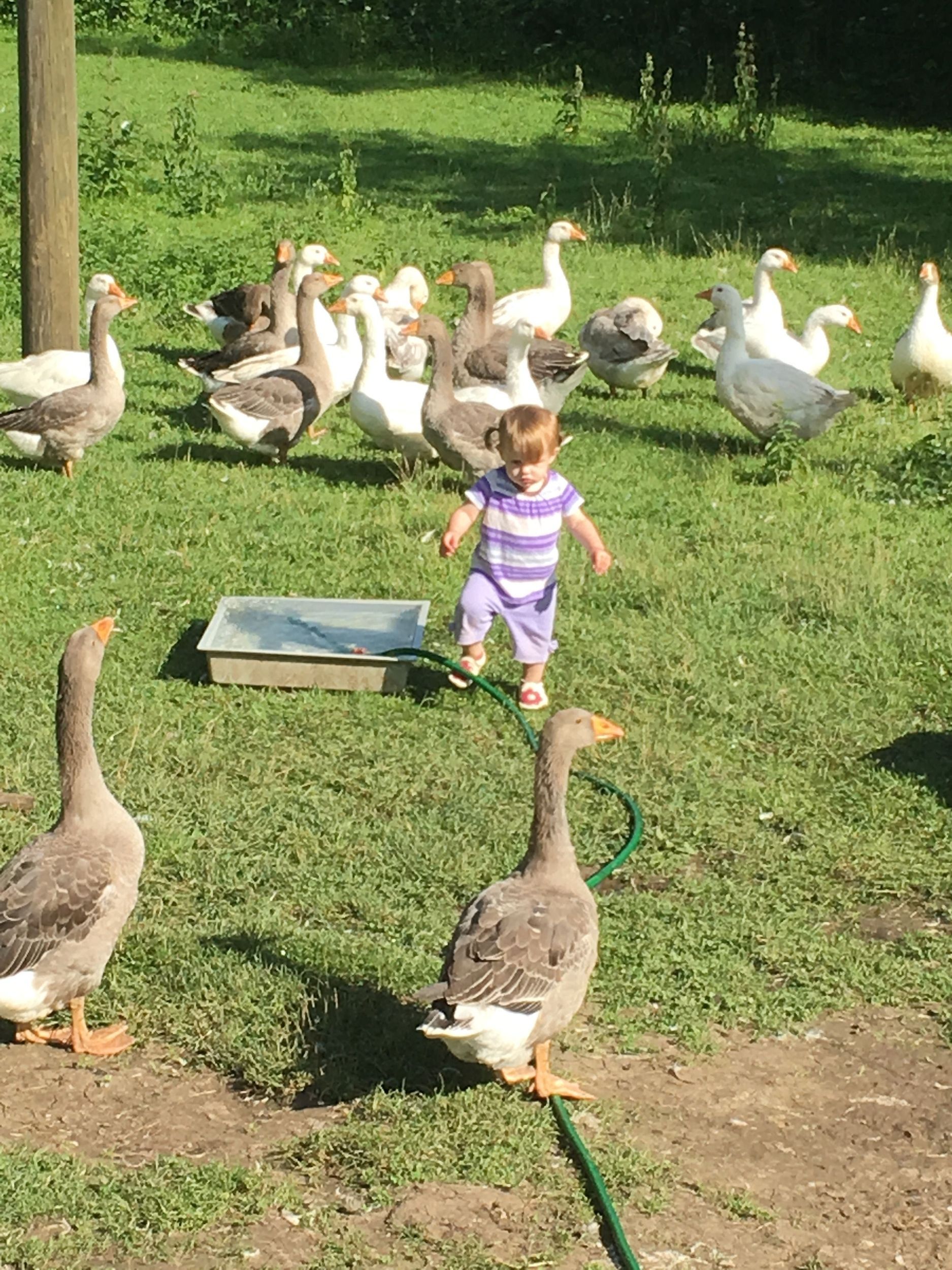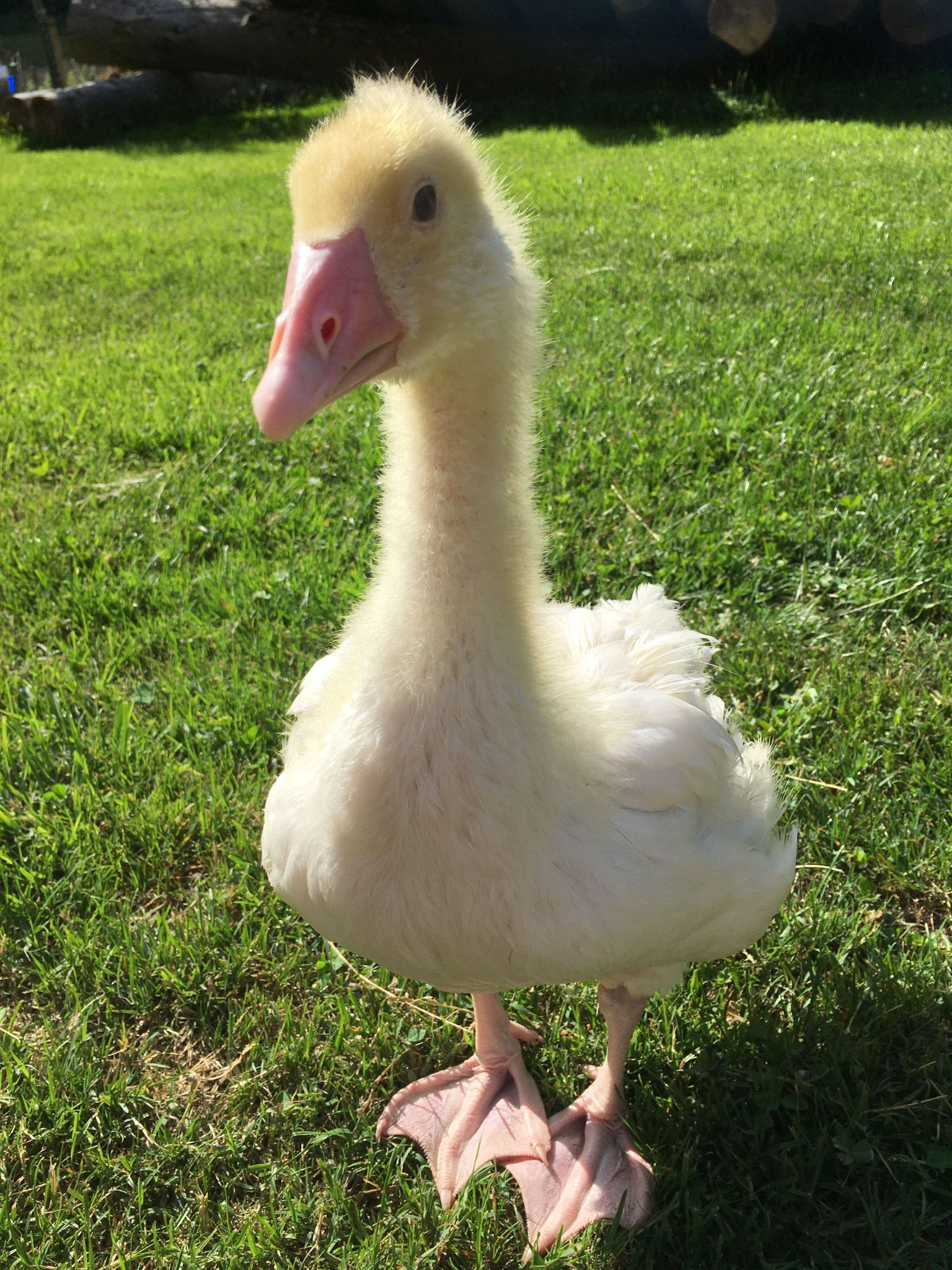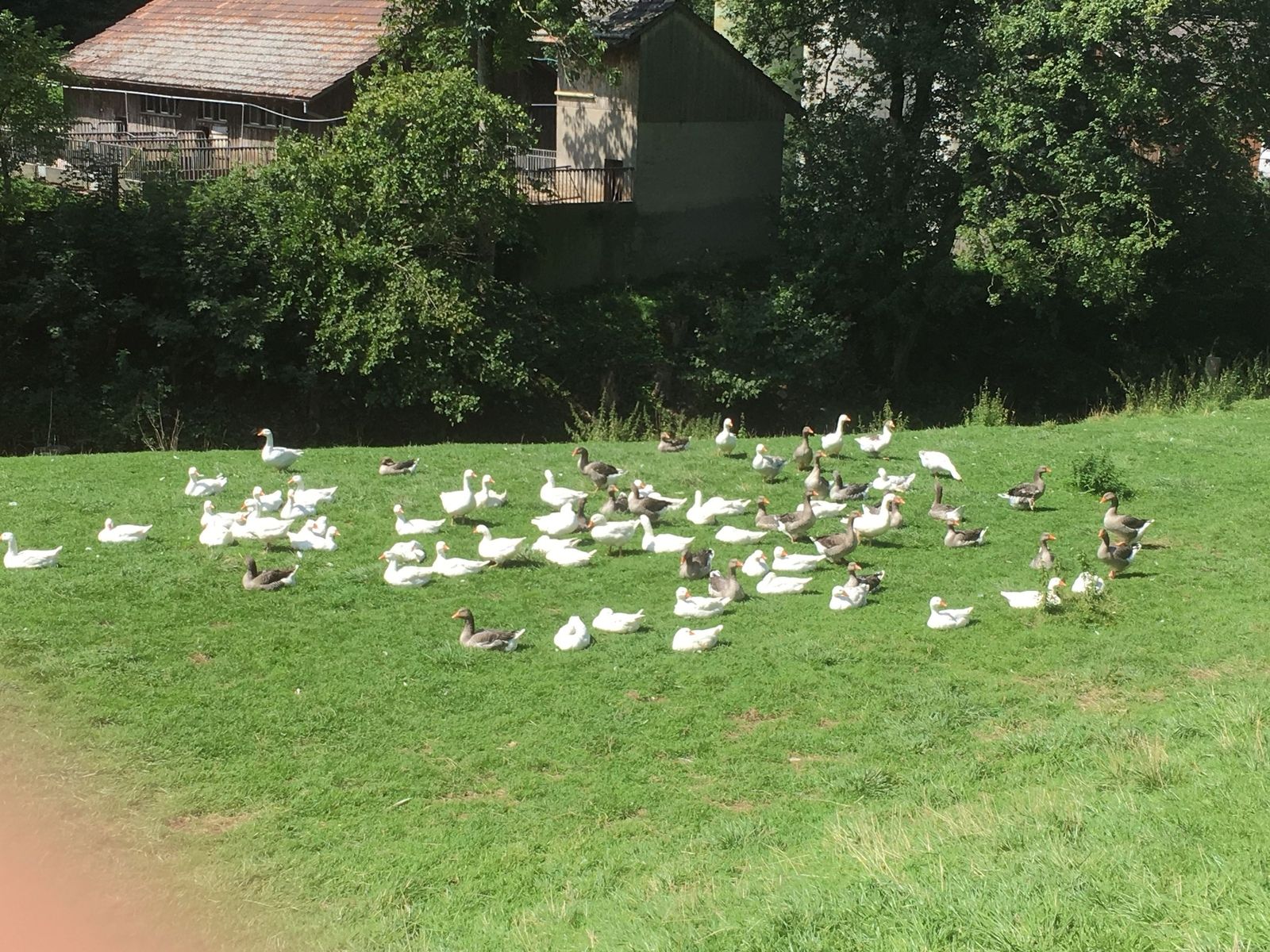40-50 Weidegänse werden bei uns jährlich grossgezogen. Sie kommen als 6-wöchige "Gössel" zu uns und geniessen den täglichen Weidegang und Zugang zu Bademöglichkeiten.